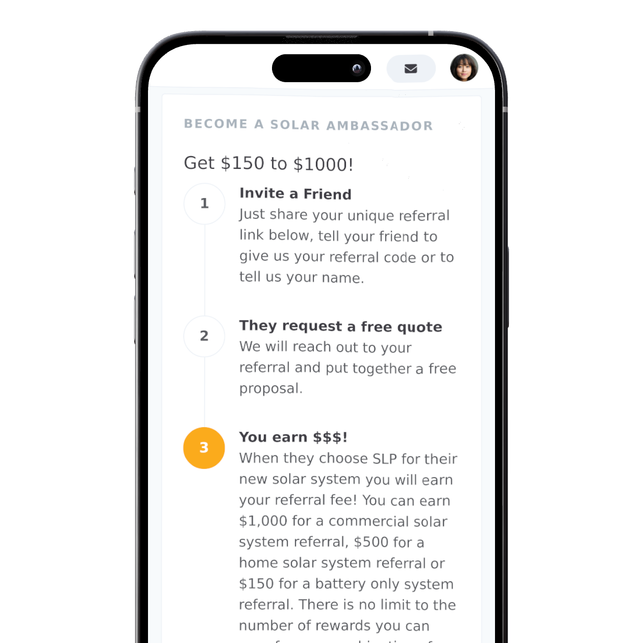 Have you been happy with Sun Light and Power? Refer a friend or family member conveniently by sending their contact info through the app or sharing your personalised referral page with them and earn money as a thank you.